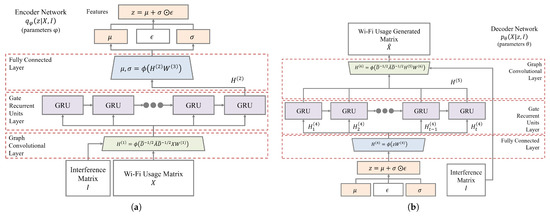 Variational recurrent graph autoencoder: (a) encoder, (b) decoder. The encoder network encodes the spatiotemporal features of Wi-Fi usage patterns into latent variables z. The decoder network generates Wi-Fi usage patterns from the latent variables z.