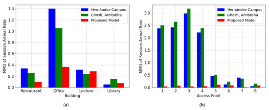 As shown in Figure 10a, the models compare the MMDs with APs installed in different buildings. The proposed model records a low MMD in restaurants and offices. Restaurants have increased traffic characteristics at mealtimes. Previous studies had a hard time representing the characteristics of the restaurant’s traffic due to a strict assumption that it increases at work time and decreases at night. The office has a higher MMD than that of other sites. The reason is that there is a significant difference in traffic volume between weekends and weekdays. For example, at 15:00, the difference between weekends and weekdays is significant. However, the models cannot consider weekends and weekdays, so they cannot distinguish between weekends and weekdays. The lecture hall and library have similar performances to the previous models.