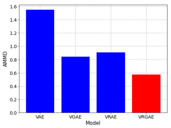 The first evaluation compared the performance of the proposed model and existing models. The evaluation compared the difference between the distribution of the sample data and the distribution of the collected data—the smaller difference between the two distributions, the better the model’s performance. The maximum mean discrepancy (MMD) is a metric representing the difference between two distributions.