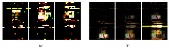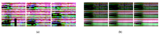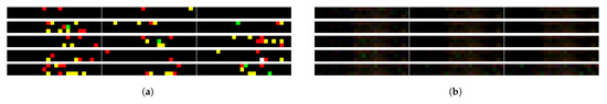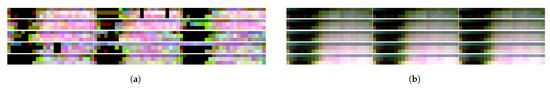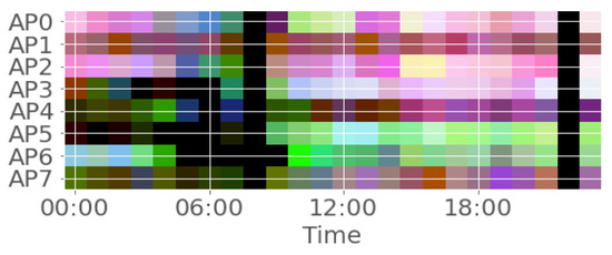 Figure 13 illustrates the Wi-Fi usage pattern of the library’s second floor during the day. Figure 13 shows the Wi-Fi usage expressed as a three-dimensional tensor, such as an image. The shape of the image is horizontal, vertical, and channel, and the shape of the Wi-Fi usage pattern is AP, time, and metric. Because both the image and Wi-Fi usage pattern form a three-dimensional tensor, the Wi-Fi usage pattern can be expressed as an image. One pixel in Figure 13 represents the Wi-Fi usage of AP i at time t. The attributes of Wi-Fi usage are in the form of number of users, RSSI, and throughput, and the image channel is in the form of (R, G, B). It can be interpreted that a pixel close to red implies that only the number of users is high, a pixel close to green indicates the RSSI is high, and a pixel close to blue implies that only the throughput is high. A pixel close to black implies that all metrics are close to 0, and a pixel close to white implies all metrics are close to 1. The number of users, RSSI, and throughput differ in scale. All metrics are mapped to values between 0 and 1 by normalization. There are many dark colors from 00:00 to 06:00 in Figure 13, which indicates that the Wi-Fi usage is low in the early morning. Subsequently, there are many bright colors from 15:00 to 24:00, which implies that the Wi-Fi usage is high in the afternoon.