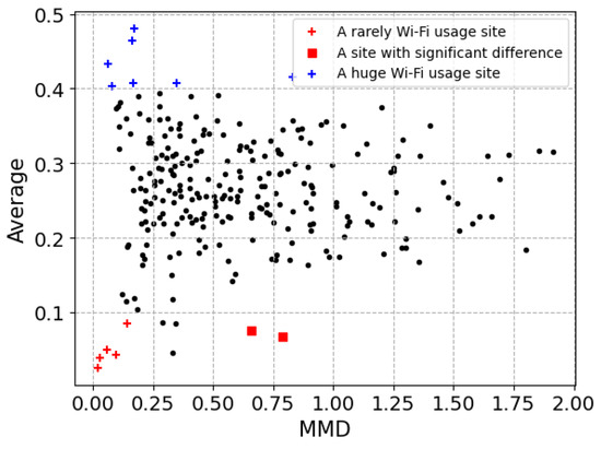 To confirm that Wi-Fi usage was high or low, all data from each site were averaged and the results were compared. Figure 16 shows the average and MMD of each site. In order to analyze sites representing clear features, the sites with extreme values were studied. There were 10 sites with an average of 0.1 or less. Among the 10 sites, there were 8 sites with an MMD of 0.4 or less again, and 2 sites with an MMD of 6 or more. There were eight sites with an average of 0.4 or more.