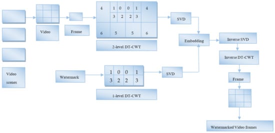 DT-CWT watermark embedding procedure in video frames.