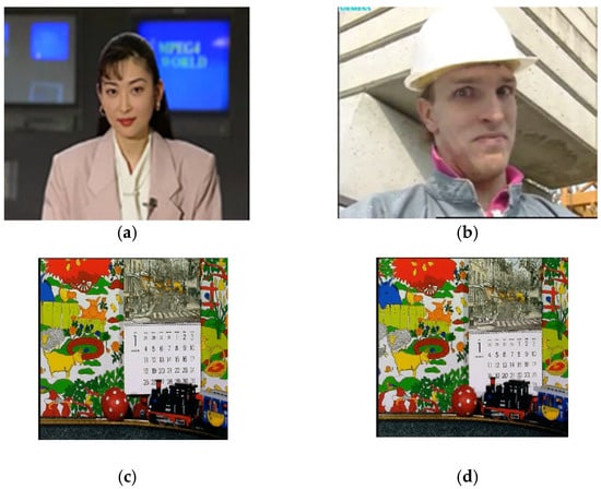(a) Akiyo. (b) Foreman. (c,d) Mobile. (c,d) Snapshots of the two scenes of the video clip.
