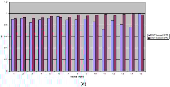 The watermarked video frames are compressed with a quality of 50% for video compression. The correlation coefficients reveal that the proposed watermarking is more robust to video compression for most frames than the DWT-based SVD watermarking, as illustrated in Figure 13 and Figure 14.