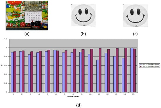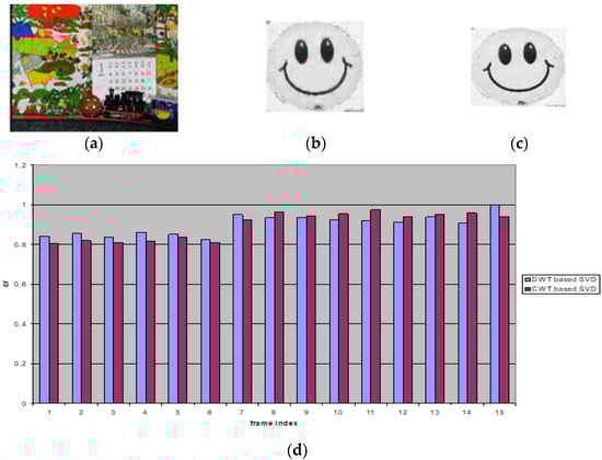 (a) The watermarked frame using the proposed method. (b) Extracted watermark from frame 10 of the second video in the proposed method. (c) Extracted watermark from frame 10 of the second video scene in the DWT-based SVD method. (d) Correlation values due to detected watermarks from each frame in the second video scene without attack.