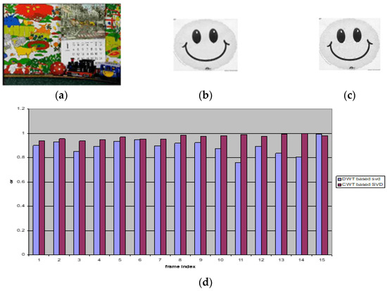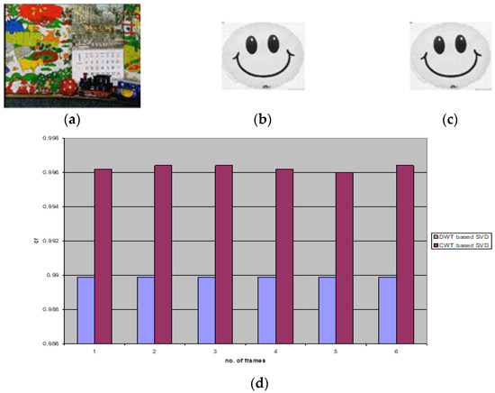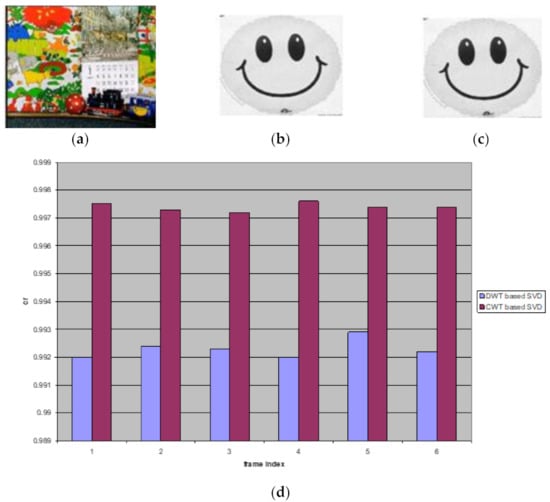 (a) The watermarked frame using the proposed method. (b) Extracted watermark from frame 10 of the first video scene in the proposed method. (c) Extracted watermark from frame 10 of the first video scene for the DWT-based SVD method. (d) Correlation values for the extracted watermarks from each six frames in the first video scene without attacks.