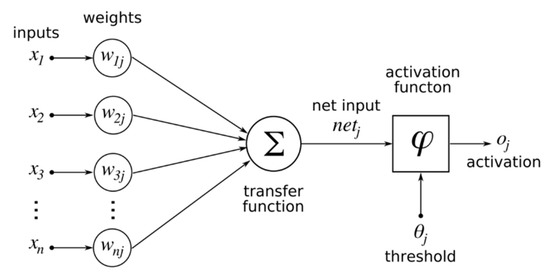 Each activation function has a different equation. The general formula is shown in Equation (1), where x is the input, w is the weight, b is the bias weight value, and n is the number of input nodes starting from j = 1.
