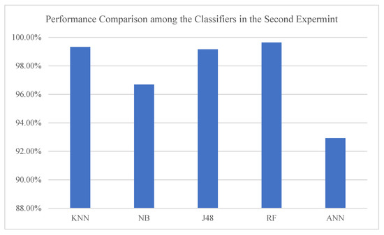 Hence, as all the models’ performance improved in the second experiment, we further analyzed the models’ performance by comparing the achieved accuracy in the second experiment. The results have shown that the RF classifier outperformed the other models and was closely followed by the KNN classifier as indicated in Figure 5.