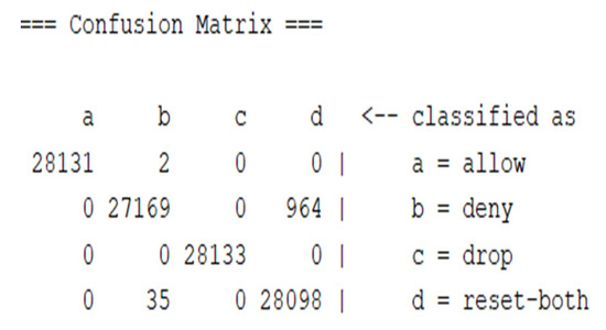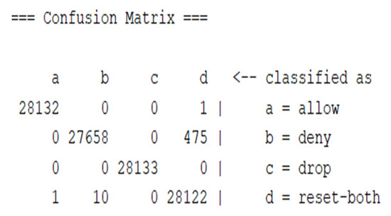 In addition, the following three papers were more closely related to our study aiming to identify the action to be taken. Those papers used a part of log records collected from a firewall device used at Firat University [11] containing 65,532 instances. In addition, through feature extraction, 11 features were obtained and used by all of the following three papers. The main paper that used and initially collected the dataset [11] was formulated by Ertam et al. [3]. In the study, the network log was classified using the SVM algorithm. The model’s performance was evaluated each time using a different SVM activation function. They performed a multiclass classification of the action attribute which takes the values “allow”, “drop”, “deny”, or “reset-both”. The highest recall value of 98.5% was achieved when the sigmoid activation function was used. The best precision of 67.5% was achieved when the linear activation function was used. Furthermore, the highest F-measure of 76.4% was obtained when the Radial Basis Function (RBF) activation function was used. Similarly, a DT classification algorithm was developed by AL-Behadili [15] for network log analysis to predict the action. The same 11 features were selected, and six benchmark classification algorithms were used, which are SVM, One R, ANN, Multiclass classifier, Particle Swarm Optimization (PSO), and ZeroR. The best accuracy of 99.839% was obtained using the DT model. Likewise, Sharma et al. [16] used the same dataset and set of 11 features to train their models. In this study, they used five algorithms, LR, KNN, DT, SVM, and stochastic gradient descent classifier. The highest performance was achieved by the DT classifier which achieved a precision of 87%. However, when they used a stacking ensemble with RF as its meta, they achieved a precision of 91% and an accuracy of 99.8%.
