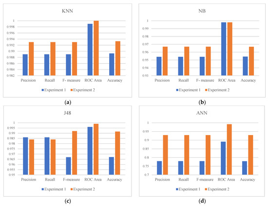 As shown in Table 7, RF achieved the best performance for all evaluation matrices in both experiments with an accuracy of 99.11% and 99.64% for experiments one and two, respectively. In general, all models performed well in terms of all evaluation matrices. Moreover, as shown in Figure 4, all models achieved better results in the second experiment compared to the performance in the first experiment. This highlights the impact of including the application and category features, especially for the ANN algorithm as demonstrated in Figure 4d.