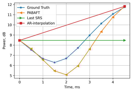 Third, the most crucial disadvantage of the standard autoregressive model (used in many related studies, see Table 1) is that the model uses discrete time, and to obtain a forecast for a moment between samples of the time series, it is necessary to use interpolation, which degrades the quality of prediction between the SRS measurements, especially if the CSI changes rapidly [21]. So, if the channel behavior between SRS periods is nonlinear, the error may be significant at the intermediate time instances even with an autoregressive model that predicts the channel state for the next SRS. One can observe this problem by comparing different channel prediction approaches during one SRS period of 5 ms, see Figure 2. Here, we show the estimated receive power from one transmitting antenna at one receiving antenna. We compare our approach (PABAFT), the usage of the last channel measurement (Last SRS), and the linear interpolation model with the ground truth. We can see that even though the linear model accurately predicts the channel for the next SRS period, it induces an error of about 8 dB in the middle of the SRS period. Thus, the linear model is only slightly better than the usage of Last SRS. Contrary to that, our approach can predict each slot with much greater accuracy.