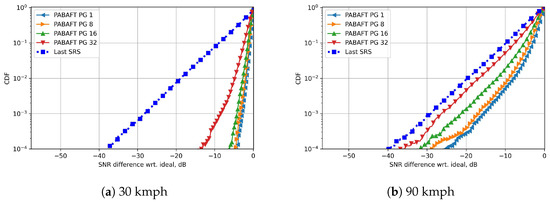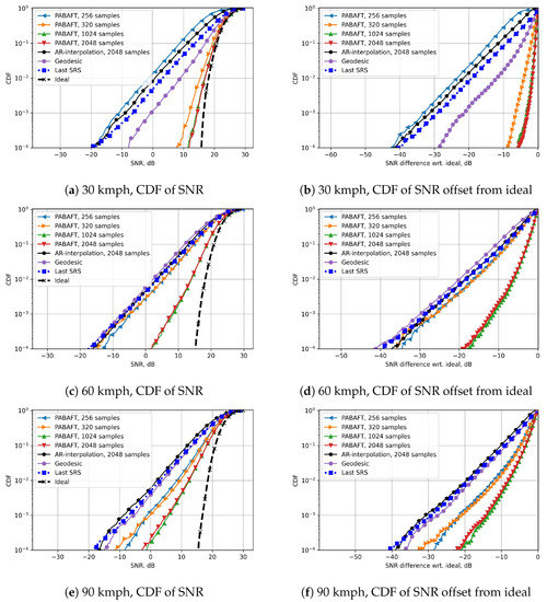 Let us consider the results for the 30 kmph case. The performance of the proposed PABAFT approach depends on the number of samples S used to train the vector AR model. For , SNR is worse than for the Last SRS approach because the low number of samples is not enough to fit the model. A higher number of samples significantly improves the performance of PABAFT. Specifically, for , we can see that PABAFT provides SNRs close to the Ideal approach (the difference at the low quantile of does not exceed 5 dB). Further increase of S does not improve the accuracy of the AR model and, consequently, PABAFT performance. Note that having antennas and a single PG, we need frames to train the model.