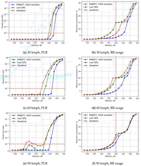 In Figure 6, we plot PLR and resource consumption as the functions of the average pathloss between the gNB and the UE. The intersection of the PLR curve with the horizontal line at shows the coverage, i.e., the maximum pathloss at which the PLR requirement is satisfied. For 30 kmph, PABAFT provides up to 4 dB coverage improvement with respect to Last SRS and up to 2 dB improvement with respect to Geodesic. For higher UE speeds, the coverage for all the considered solutions reduces. However, the proposed PABAFT approach still provides up to 4 dB gain even at 90 kmph UE speed. Note that the performance of Geodesic is worse at 60 kmph speed than at 90 kmph speed. The explanation for this effect is similar to those mentioned in Section 4.2: Doppler frequency is close to the frequency of channel sampling leading to significant errors in the estimation of the signal phase.
