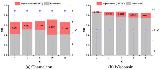 In Figure 6, the horizontal axis represents the attempted K values. The left Y-axis corresponds to the achieved accuracies by the k-means++ (gray bar) and the corresponding improvements made by IBSVC (red bar). The numerical value marked on the red bar is the quantized improvement. As can be seen, there are significant improvements in accuracy, except for 20Newsgroup with , Wisconsin with , and with . In fact, the corresponding K values are equivalent to or close to the ground truth of the class number (see Table 2). Since the k-means++ insists on dividing the data space into K clusters, we only present the number of clusters discovered by IBSVC using a scatter diagram, which refers to the right Y-axis. For most cases, the discovered cluster numbers do not fluctuate dramatically with the change of K. In fact, is also equivalent or close to the ground truth. As with the results above, IBSVC makes a major contribution to accuracy improvement. Meanwhile, clear evidence confirms the adaptive ability of IBSVC in cluster discovery. It performs stably even though there is no sufficient prior knowledge about K. Therefore, before setting K, the first thing we should consider is efficiency.