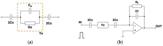 (a) Equivalent circuit for a model of complex capacitance measurement with capacitive coupling. (b) Integrator-based measurement circuit.