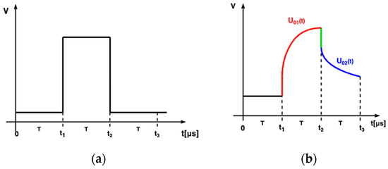 Similarly, using the Laplace analysis, the trailing edge of the integrator response was analyzed (Figure 2b). The voltage at the integrator output after the falling edge of the exciting rectangular pulse, i.e., after the time , is described by the following formula: