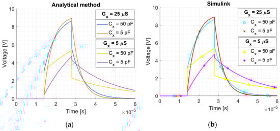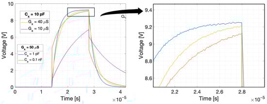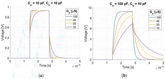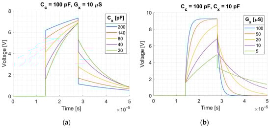 The plots of the voltage response at the integrator output calculated using Equations (13) and (14) to rectangular pulse for different values of measured capacitance, conductance, and coupling capacitance are shown in Figure 3 and Figure 4. The excitation pulse with the amplitude V and duration was used. The duration of the pulse corresponds to the duration of the excitation pulse used in our EVT4 tomographic device. In this device, a high voltage is used to measure non-conductive objects. A voltage of 2.5 V is sufficient to obtain a good signal in the case of conductive mixtures or biological tissue.
