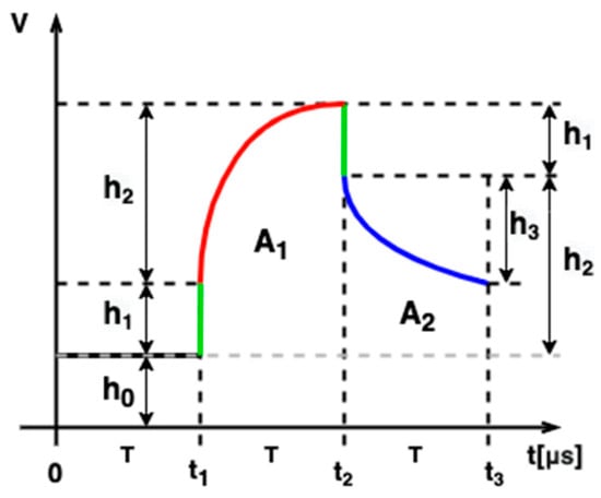 where is a value of the -th sample. At the time , the pulse front appears with a voltage surge of the value resulting from capacitance charging. The pulse ridge is sampled in the second phase between and . Two parameters can be calculated from these samples. The area under the pulse ridge is calculated using the following formula: