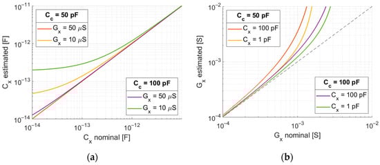 In this derivation, it is assumed that the amplitude of the excitation square pulse, the integrator gain, and the value of the coupling capacitance are known. The analysis of the formulas shows that the method can be used only in a certain range of permittivity and conductivity values. This range depends on the value of the coupling capacitance, the assumed pulse duration, and the sampling frequency. The range of linearity of measurement of one component depends on the value of the other component. For both components, there are areas where the method is not sensitive to changes in the measured value. Figure 8 shows the dependence of the estimated value as a function of the true value for both capacitance and conductivity. The value of coupling capacitance was equal to 100 pF, the pulse duration was 14 µS, and the sampling frequency was 9 MHz. Under these conditions, the range over which the proposed method is sensitive to the change in permittivity and conductivity is respectively from 1 pF to 100 pF and from 10 µS to 1 mS.