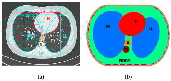 (a) Computed tomography cross-section of the human chest with marked regions. (b) The geometry of the numerical phantom of the human thorax. H—heart, A—aorta, S—spine. Thirty-two electrodes used in the measurement and the outer screen are shown.