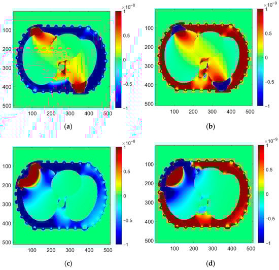 The electric field for all voltage excitations, the sensitivity matrix, and capacitance between electrode pairs were calculated using the toolbox (Figure 10). As the electric parameters of material, i.e., conductivity and permittivity, were defined as complex values, the complex electric field and complex sensitivity maps for electrode pairs were calculated [39]. The inverse problem was solved for a frequency equal to 500 kHz.