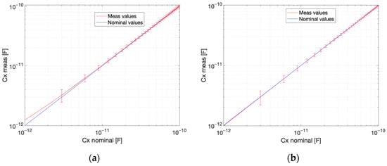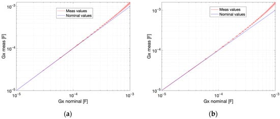 Estimated conductance value vs. nominal value: (a) capacitance , (b) capacitance . Coupling capacitance . Uncertainty bars represent the 3-sigma range.