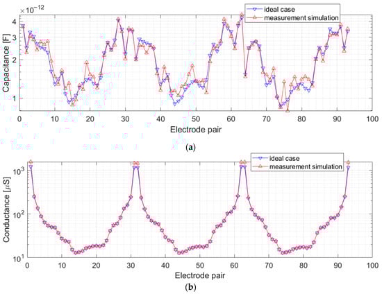 Solving a forward problem allows obtaining complex capacitances of the object without taking into account the parameters of the measuring electrodes and connecting leads. Such data cannot be observed in a real system. The data generated in the forward problem solver served as the reference data in the experiment. The second dataset was generated using the front-end circuit model and the proposed method of processing digital samples. The first dataset represented the ideal case, whereas the second represented the proposed measurement method.