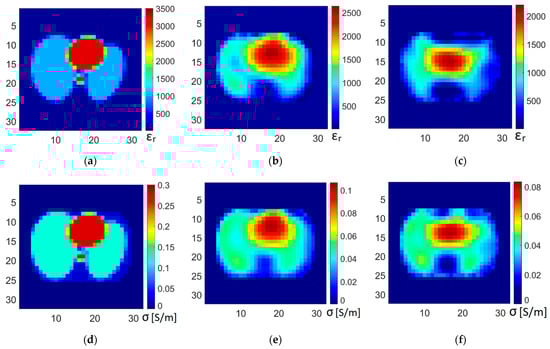 Reconstructed images of permittivity and conductivity. True distribution in numerical phantom: (a) permittivity, (d) conductivity. Images reconstructed from ideal data: (b) permittivity, (e) conductivity. Images reconstructed from data obtained using the pulse excitation measurement: (c) permittivity, (f) conductivity.