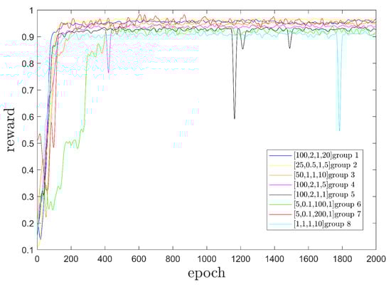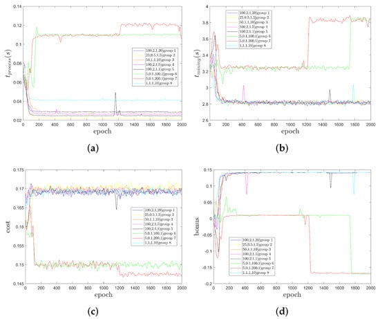 Moreover, from Figure 6a,b, we can tell that the order of magnitude of process delay and mining delay is different. As mentioned above, if the increase in reward from choosing a different policy is small in comparison to the change introduced by random search, the algorithm will not converge. To avoid this phenomenon, the ratio of and remain the same from group 1 to 7. However, in group 8, the order of magnitude of process delay is much smaller than that of mining delay in reward function, which means that the reduction in the process can be smoothed out by the variance of mining, thus preventing the algorithm from continuing to converge. The process delay only converges at 0.04 s in the end.