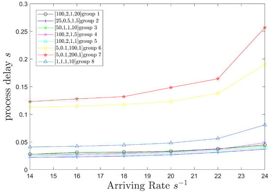 As shown in Figure 7, it can be seen that the increase of affects group 6 and 7 greatly. When it reaches 24 , the of group 6 and group 7 reaches 0.18 s and 0.26 s, respectively. However, other groups manage to resist the increase, maintaining the amplification within 70%. Furthermore, it can be concluded that the results obey the latency rule of M/G/s model raised by Boxma [38]. Within the results, we fit the equivalent removing rate of edge computing service system under this circumstance as 40 . In the experiment, the average data size is 7 × 5 Mb. If the policy is to lower the latency, the average data size distributed to each server is 35/4 Mb. Each bit needs a CPU Cycle of Hz. The average capability of each server is 16.5 . Thus, the average processing rate of each server can be worked out: 47.83 . The estimation result and fitting result have the same order of magnitude.