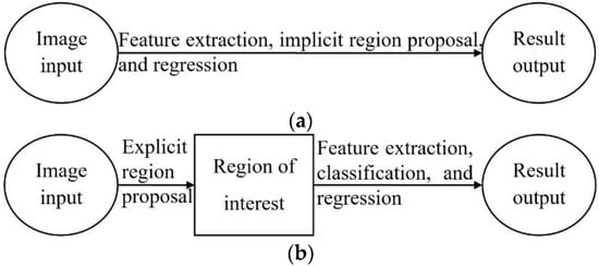 Deep learning network has met its great success in recent years. Regarding the target detection task, in general, deep learning network can be classified into the one-stage method and two-stage approach [10]. The one-stage method uses regression analysis to detect targets. This method omits the generation procedure of candidate regions and gets target classification and position information directly. On the other hand, the two-stage approach considers selective searching or edge boxes to obtain the possible target-contained region proposal; then, it estimates the target region by using candidate region classification and position regression. The representative networks and their computational flow charts are illustrated in Table 1 and Figure 1. Another classification method of deep learning technique includes anchor-based and anchor-free methods. The anchor boxes are a type of multi-scale descriptor that can mark potential regions of target. For example, most methods listed in Table 1 belong to the anchor-based method, with the exception of CornerNet.