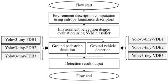 Figure 2 presents the proposed computational flow chart of our ground pedestrian and vehicle detection algorithm. From Figure 2, both the entropy-based luminance descriptor and SVM classifier are used for imaging environment perception; six improved Yolov3-tiny networks are used for ground pedestrian and vehicle detections. In Figure 2, Yolov3-tiny-PDB1, Yolov3-tiny-PDB2, and Yolov3-tiny-PDB3 were employed to detect ground pedestrians when imaging luminance is excellent, ordinary, and severe, respectively. Yolov3-tiny-VDB1, Yolov3-tiny-VDB2, and Yolov3-tiny-VDB3 were used to detect ground vehicle when imaging luminance is excellent, ordinary, and severe. Excellent imaging luminance means that the environment’s light intensity is ~≥1500 lx; ordinary imaging luminance means that the environment’s light intensity is ~≥300 lx and ~<1500 lx; severe imaging luminance indicates that the environment’s light intensity is ~≥50 lx and ~<300 lx.