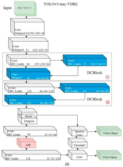 Structures of the basic and improved Yolov3-tiny networks [42,43,44,45]. (a) Structure of the classic Yolov3-tiny. (b–d) Structures of Yolov3-tiny-PDB1, Yolov3-tiny-PDB2, and Yolov3-tiny-PDB3: the network of ground pedestrian detection under excellent, ordinary, and severe imaging luminance conditions. (e–g) Structures of Yolov3-tiny-VDB1, Yolov3-tiny-VDB2, and Yolov3-tiny-VDB3: the networks of ground vehicle detection under excellent, ordinary, and severe imaging light conditions. The dashed boxes and their corresponding red numbers will be used in ablation analysis experiment.