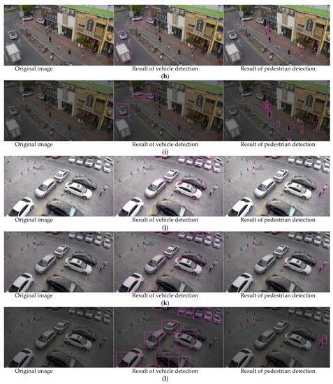 Table 5 provides the corresponding results using different deep learning networks and test datasets. In Table 5, a series of datasets was used for network evaluation: Mixture datasets do not distinguish imaging luminance and use all accumulated image data to train networks (i.e., the proportions of three types of image dataset are equal); the typical datasets only consider image data with the same imaging luminance to build their training and test datasets. In this experiment, the sizes of the training datasets (including the Mixture dataset1, Typical dataset1, Typical dataset2, and Typical dataset3) of pedestrian detection are all 2354; the corresponding test data sizes are all 262; the sizes of training datasets (including the Mixture dataset2, Typical dataset4, Typical dataset5, and Typical dataset6) of vehicle detection are all 2219, the corresponding test data sizes are all 555. From Table 5, regarding mixture datasets, our networks (including both Yolov3-tiny-PDB2 and Yolov3-tiny-VDB2) for ordinary luminance application can obtain the best results among all networks. As for the image data captured in typical luminance degrees, our networks also can obtain the best processing effects in their individual test experiments. Table 6 shows the computational speeds of all networks in Table 5. From Table 6, our networks can accomplish pedestrian and vehicle detections within 8.0 ms per frame. Figure 6 presents examples of ground pedestrian and vehicle detection results of our proposed method, and images with different scenes and environment luminance are used. In Figure 6, a purple rectangle is used to mark the detected vehicle and pedestrian. Figure 7 shows the processing examples of images with the same scene but different environment luminance. In Figure 7, although imaging luminance is different, the detection results are the same. From Figure 6 and Figure 7, our method can detect most pedestrians and vehicles in complex scenes with different environment luminance degrees.