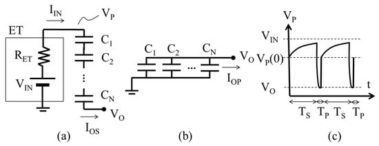 Figure 2 shows those two configurations of DC-DC SC-VDC with CLK = H and L in (a) and (b), respectively, namely in a serial state and in a parallel state. An SC-VDC has N capacitors, each of which has the same capacitance C. The input current IIN flows in the serial state. The output currents IOP and IOS flow in the serial and the parallel states, respectively. Figure 2c shows the waveform of VP at the interface between ET and SC-VDC. The serial state required a longer period (Ts) than the parallel one required (TP) because the capacitors were charged via a large resistor RET in Ts, whereas they were discharged via a small on-resistance of switches in TP. Thus, the clock frequency was limited by TS. When TS increased, the amount of charge stored in the capacitors increased, and the cycle time also increased. Overly long TS could reduce the average output current (IO) because the amount of charge saturated for long TS. On the other hand, when Ts decreased too much, the charge transferred into the capacitors decreased as well. TS that was too short could also reduce IO. As a result, there should be an optimum TS to maximize Io between two extreme conditions. Firstly, we will look at the circuit behavior in the case where RET is sufficiently small, and then, we will investigate the case where RET is significantly large.