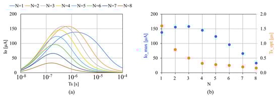 How can circuit designers maximize Io when the total capacitance is given? IO vs. TS plots for various N can tell them the answer. Figure 4 is a demonstration assuming CTOT = CN = 100 pF and the other parameters are given by Table 1. The optimum Ts to maximize Io depended on N because τ varied as N−2 when CN was constant (τ = RET C/N = RET CTOT /N2). One can find the maximum Io (IO_MAX) for each N at TS_OPT from Figure 4a. Figure 4b shows IO_MAX vs. N when CN = 100 pF. In this demonstration, one can extract 160 μA at 1 V with N = 3 and Ts= 500 ns. The above procedure to determine the optimum N and Ts will be used in Section 3.