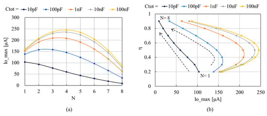 The above procedure could be performed for various CTOT as shown in Figure 6a. The maximum attainable power from a given ET specified with VIN and RET (PATT) was given by (22c) under a power match, when the input impedance of the converter was matched with RET. In case of the conditions given in Table 1, PATT was 250μW (10 V2/4 × 100 kΩ). As shown in Figure 6a, by increasing CTOT, IO_MAX approached PATT/Vo. The value of NOPT that provided the largest IO_MAX was the one with a small CTOT, whereas the value given by (22b) was one with a sufficiently large CTOT.