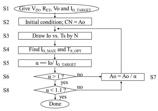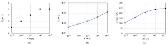 A demonstration is made for IO_TARGET of 100 μA at Vo of 1 V and AO of 100 pF. By running the design flow as shown in Figure 10, CTOT, TS_OPT, NOPT and thereby IO_MAX were determined in each loop as shown in Figure 11. NOPT varied from three in the first loop to one in the final tenth loop in this demonstration. TS_OPT increased at the moment when NOPT decreased, because τ decreased. In total, Ao gradually decreased from an initial condition of 100 pF to the final value of 7.5 pF where IO_MAX reached 110 μA.