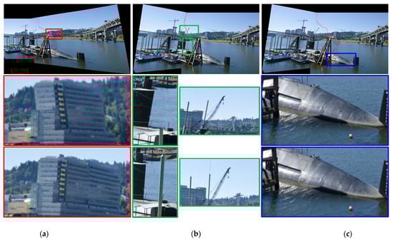 Figure 6 and Figure 7 give an example of image stitching where the parallax between the two input images is extremely large. The two input images to be stitched and the corresponding difference cost map calculated by the proposed method are given in Figure 6. Figure 7 shows the comparison of the stitching results of the scene in Figure 6. Compared with the partial enlargement of the region in the final stitched image in dataset [17] shown in the third row of Figure 7a, the result of the perceptual seam-cutting method in [18] has serious structural distortion at the building, as shown in the second row of Figure 7a, because the seam passes through this background building. However, for the traditional seam-driven method based on color and texture information, as shown in the second row of Figure 7b, there are obvious stitching errors, the upper part of the green stick disappears, and the tower crane behind also shows geometric distortion. By contrast, benefiting from the introduction of scene depth information in the energy function, the seam found by the proposed method bypasses the building and tower crane at the background, avoiding the structural distortions, as shown in Figure 7a,b, and the pontoon at the foreground is also well stitched, as shown in the second row of Figure 7c.