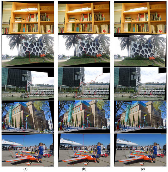 Figure 5c is the result of the proposed method. Since the color, texture, and depth information of the scene are comprehensively considered, the understanding ability of the stitching method to the scene is prompted. Therefore, the proposed method can find the seam according to the depth of the scene and bypass the prominent foreground regions. As shown in the second row of Figure 5c, the proposed method does not produce structural distortion in the edge regions where the depth changes significantly. By contrast, the result of the method in [17] has a stitching error. There are two duplicated black dots appearing in the center right of the stitched image, as shown in the third row of Figure 5c.
