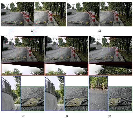 It can be found that there are obvious blur regions at the tree top in the red boxes, derived from the inappropriate position of the used seam in the process of Poisson fusion. Compared with the other two methods, the proposed method produces much less blurring. For the regions in the blue boxes, there exist obvious structural distortion at the bottom of the wall, as shown in partial enlargements of Figure 9c,d. The proposed method also produces some structural distortion in the region enclosed by the blue box, but the distortion is not obvious in subjective perception because the background here is thick leaves and the distance is relatively far. As shown in the green boxes, although the regions of paved road generated by the three methods are slightly different on both sides of the seam, the brightness difference is relatively small compared with that without brightness correction, so the naturalness of the paved road is improved. This indicates that brightness/color correction helps to hide the seam and improve the quality of the stitched image when the brightness/color of the images to be stitched is inconsistent.
