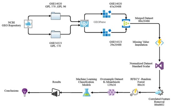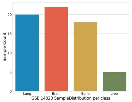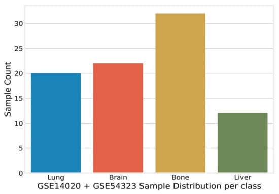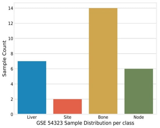 The research work in this paper successfully predicts metastasis’s location employing different machine learning algorithms using a dataset that is publicly available named NCBI Gene Expression Omnibus (GEO) GSE14020 [11] and GSE54323 [12]. These microarray datasets are merged to produce a combined dataset with a dimension of . Microarray technology is a genetic disorder research tool that includes several thousand genetic expressions (features) and hundreds of samples. Each genetic expression calculates the activity level of the genes in a given tissue. Thus, comparing the abnormal cancerous tissue genes offers valuable insights into the disease’s pathology and makes it possible to better diagnose future sample estimates as described in [13]. The missing values, high dimensionality, and imbalance class of the gene expression in the dataset are significant when building an accurate breast cancer prediction classifier.