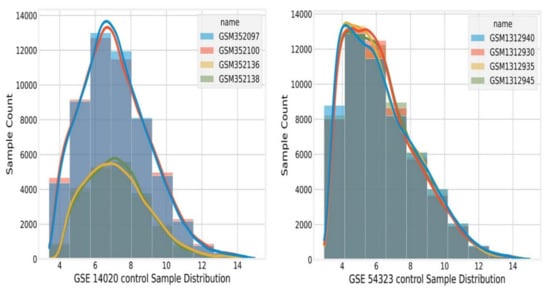 Dataset GSE14020 contains 65 samples collected using two platforms, GPL96 (36 samples with 22,283 gene probe ID) and GPL570 (29 samples with 54,675 gene probe ID), whereas dataset GSE54323 29 samples were collected using GPL570 (54,675 gene probe ID). Samples are collected using different platforms with different numbers of gene probe IDs. To induce uniformity across the dataset, samples were merged based on the common platform GPL570 (22,283 gene probe ids) and Entrez Gene ID (Unique Gene record identifier), thus reducing the number of features/gene probes IDs to 20,486. The dataset shape achieved after transformation is and where are the features/independent variables and prognosis location of metastasis . The distribution of four controlled samples is shown below in Figure 2. The histogram’s careful analysis shows that samples are not normally distributed; instead, it is right-skewed. The data, therefore, needs transforming for further processing.