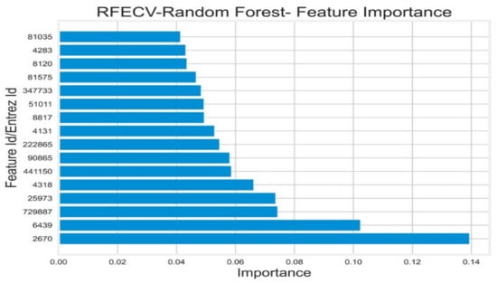 Recursive Feature Elimination with Random forest with stratified K-fold cross-validation reduced the optimal number of features from 6602 to 16. The optimal number of features and their importance is shown in Figure 4 and Figure 5 below.