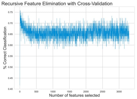 Random forest (RF) is a supervised machine learning algorithm. It generally works well with high dimensional datasets and can recognize a given result’s strong predictors without making any basic model assumptions. However, correlated predictors are a common problem with high-dimensional data sets. RF’s efficiency in recognizing the most potent predictors decreases the significant calculated scores of correlated variables. Highly correlated variables were already removed in the last step. The Random-Forest-Recursive Feature Elimination (RF-RFE) algorithm is a proposed solution. RFE performs the selection of features by iteratively training a model, classifying features, and eliminating the lowest ranking attributes [37]. RFE needs a range of features to be preserved. However, the number of features that are authentic is also not decided in advance. Cross-validation is used with RFE to score specific feature subsets and select the best scoring collection of possible features or attributes. In this experimental study, the Stratified K-fold cross-validation was used for recursive feature elimination. Stratified K-Fold shuffles the data split into n_splits parts. Each split is used as a test set. It constantly shuffles data once before splitting and does not overlap test sets.