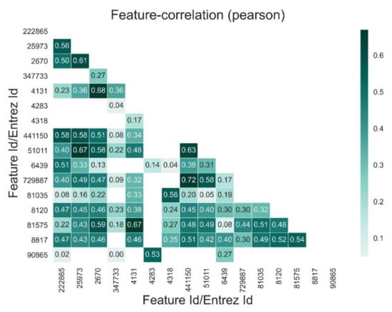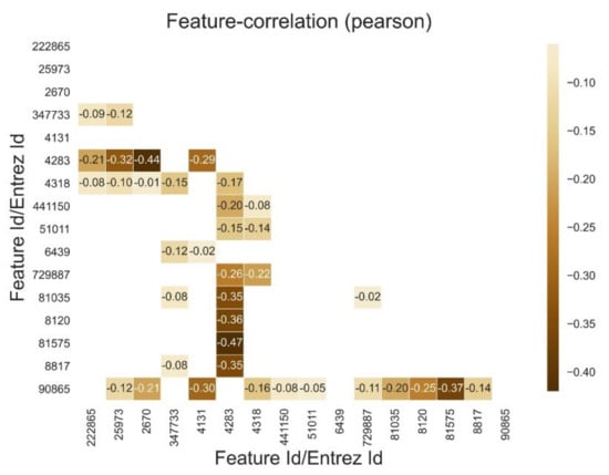 Before proceeding further, the highly correlated features were removed. All the independent variables having a Pearson correlation coefficient greater than 0.8 or less than −0.8 were removed. 13,884 features were removed, thus reducing the reduced dimension of the dataset to Appendix D.