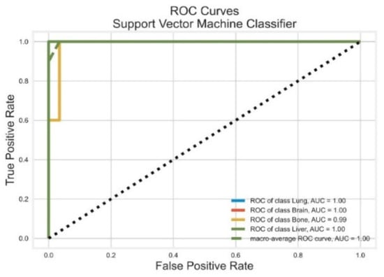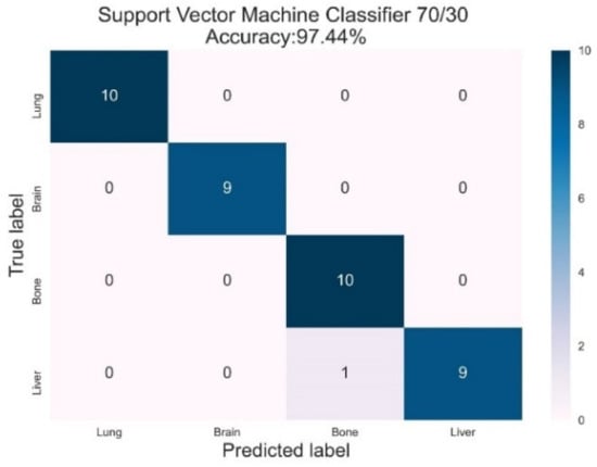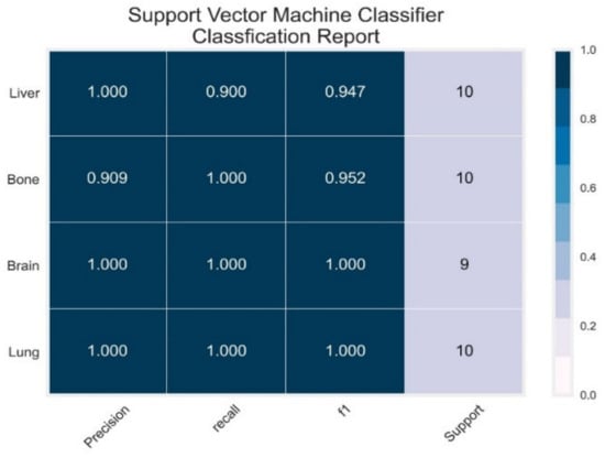 In this work, datasets were transformed into a readable format. The selected dataset contains gene expression microarrays of different dimensions that need to be merged based on a common platform (GPL570) and a unique gene identifier (Entrez ID). Data were imputed for missing values and normalized. Gene expression data is known to have the curse of high dimensions. First, highly correlated features were removed and then two-dimensionality reduction techniques were employed to reduce dimensions to cater to this issue. Various classification models were employed with different tests and training split ratios to determine the best accuracy model. In the process, a handful of unique genes that can identify the metastasis location, i.e., brain, bones, lungs, and liver, were able to be identified in a BC patient. The authors of this research have not come across any study that has achieved the said objective. Figure 1 shows the proposed architecture for the identification of breast cancer in vital organs using microarrays.
