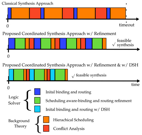 Illustration of the disadvantages of the classical synthesis approach along wit the advantages of the coordinated and coordinated+DSH approach. The classical approach spends a considerable amount of time within the background theory until reaching a timeout. The coordinated synthesis approach significantly increases the applicability of symbolic system synthesis by introducing an additional scheduling-aware binding and rounting refinement. The coordinated+DSH approach, which includes domain-specific heuristics (DSH) in the logic solver, furthermore increases the scalability of the coordinated approach and reduces the average synthesis time, too.