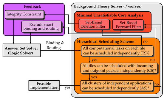 Thus, a feedback to the logic solver is generated that restricts the subsequent binding and routing solutions of the logic solver (purple box in Figure 2). Here, as mentioned earlier, the indicator variables are used to constrain the search space by adding so-called integrity constraints to the set of rules of the logic solver (see Section 5). All following binding and routing implementation solution candidates will avoid all conflicts from the background theory that have been learned so far. The iterative coupling between logic solver and -solver stops with a successfully hierarchical scheduling or if the logic solver returns the result UNSAT (unsatisfiable). In the latter case the SMT-based synthesis approach proved that there exists no feasible implementation with respect to the system’s specification.