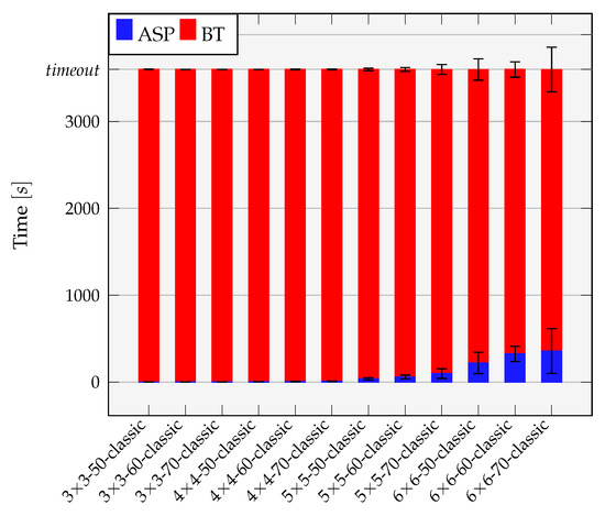 Often, having more variables and constraints in the answer set solver can increase the time to derive a solution of the binding and routing sub-problem. Additionally, once an initial solution is found, the answer set solver spends up to to optimize this solution (or prove that the found initial one is the optimal solution). While for all the 3 × 3 mesh grid instances in the classical approach (note that more detailed data of the solved instances for the classical approach is not shown for the sake of brevity.) the total average time spend in the answer set solver in successful runs is less then , for the same instances it is around 20 s in the coordinated approach.